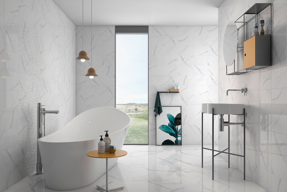 Terni recrée le marbre calacata naturel dans une finition brillante avec un relief intérieur décoratif.